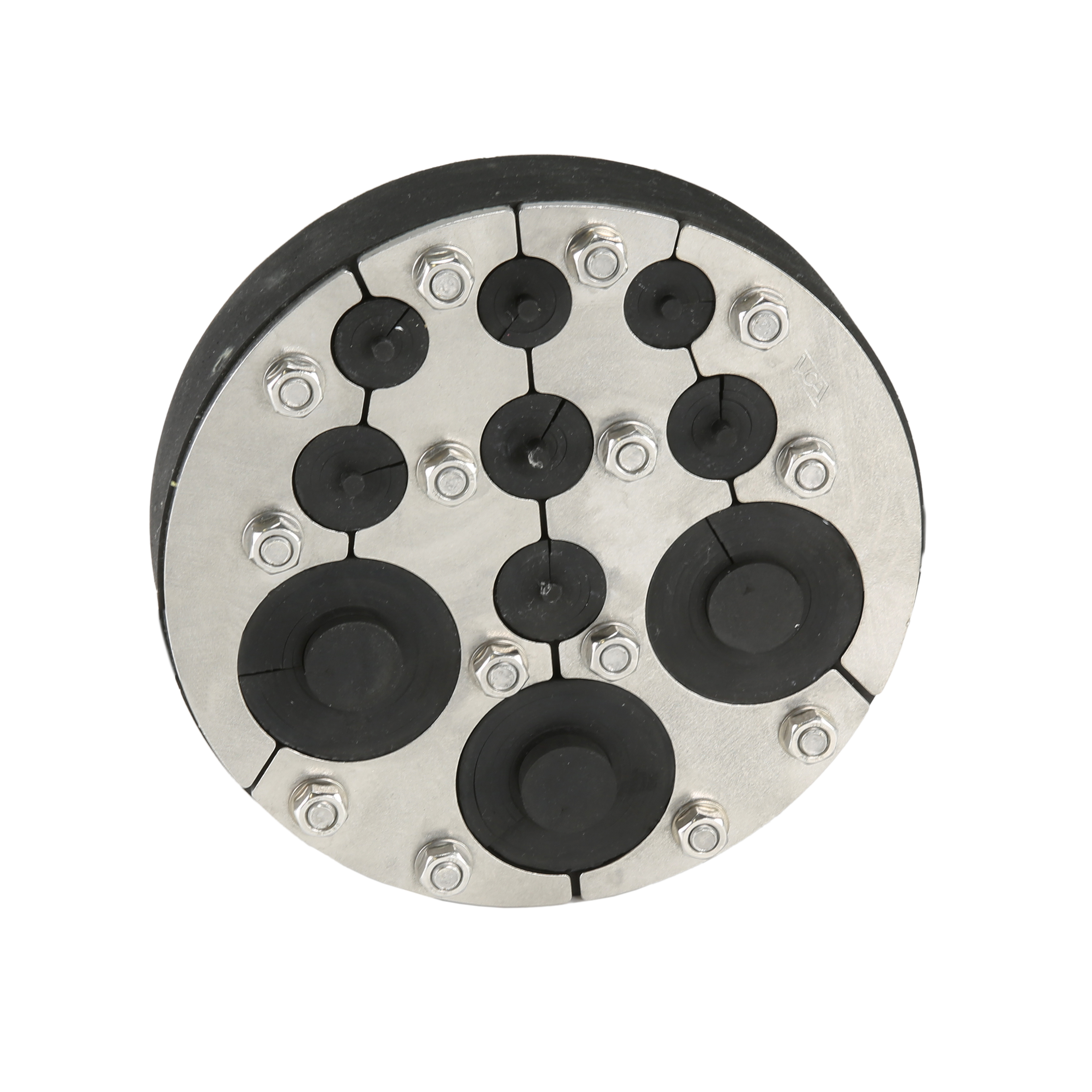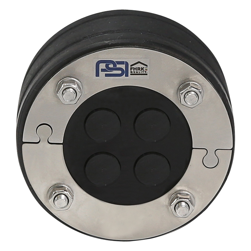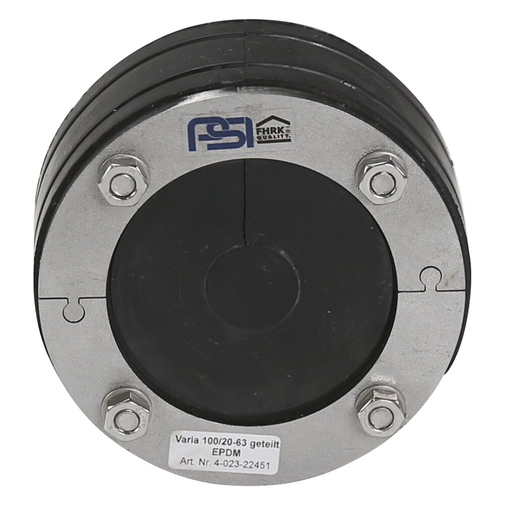 Abdichtung von Mauerdurchführungen mit Gas-, Wasser-, Abwasserrohren. Zusätzliche Bohrungen (10/14 mm) in der Druckplatte für z.B. Glasfaserkabel (7-14 mm). Mehrere Durchmesser können durch die Zwiebelringtechnik abgedichtet werden..