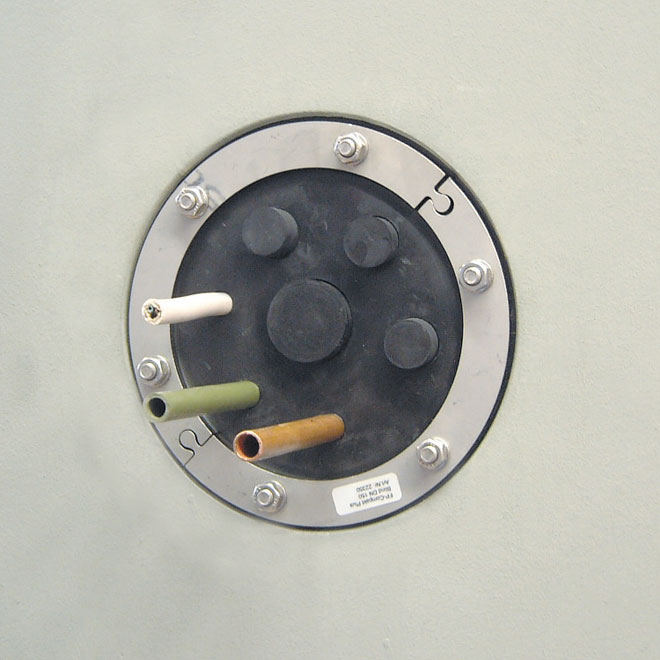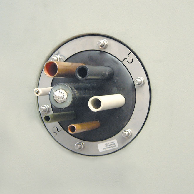 Die Belegung der Durchführungen für Mediumrohr- und Kabel-Außendurchmesser von 4 bis 32; 40; 50 mm kann frei gewählt werden (unter Berücksichtigung der Berechnungsgrundlagen und der bauseitigen Eignung des Produktes). Die Dichtung ist druckdicht bis 1 bar. Das System ist teilbar und für den nachträglichen Einbau geeignet. Für jede Durchführung werden Blindstopfen mitgeliefert, die vor dem Einführen des Mediumrohres entfernt werden. Nicht belegte Bohrungen können mit einem Blindstopfen druckdicht verschlossen werden. Somit ist es auch möglich, vorgesehene Durchführungen nachträglich einzubauen. Für die Montage wird außer einem Drehmomentschlüssel kein Spezialwerkzeug benötigt.